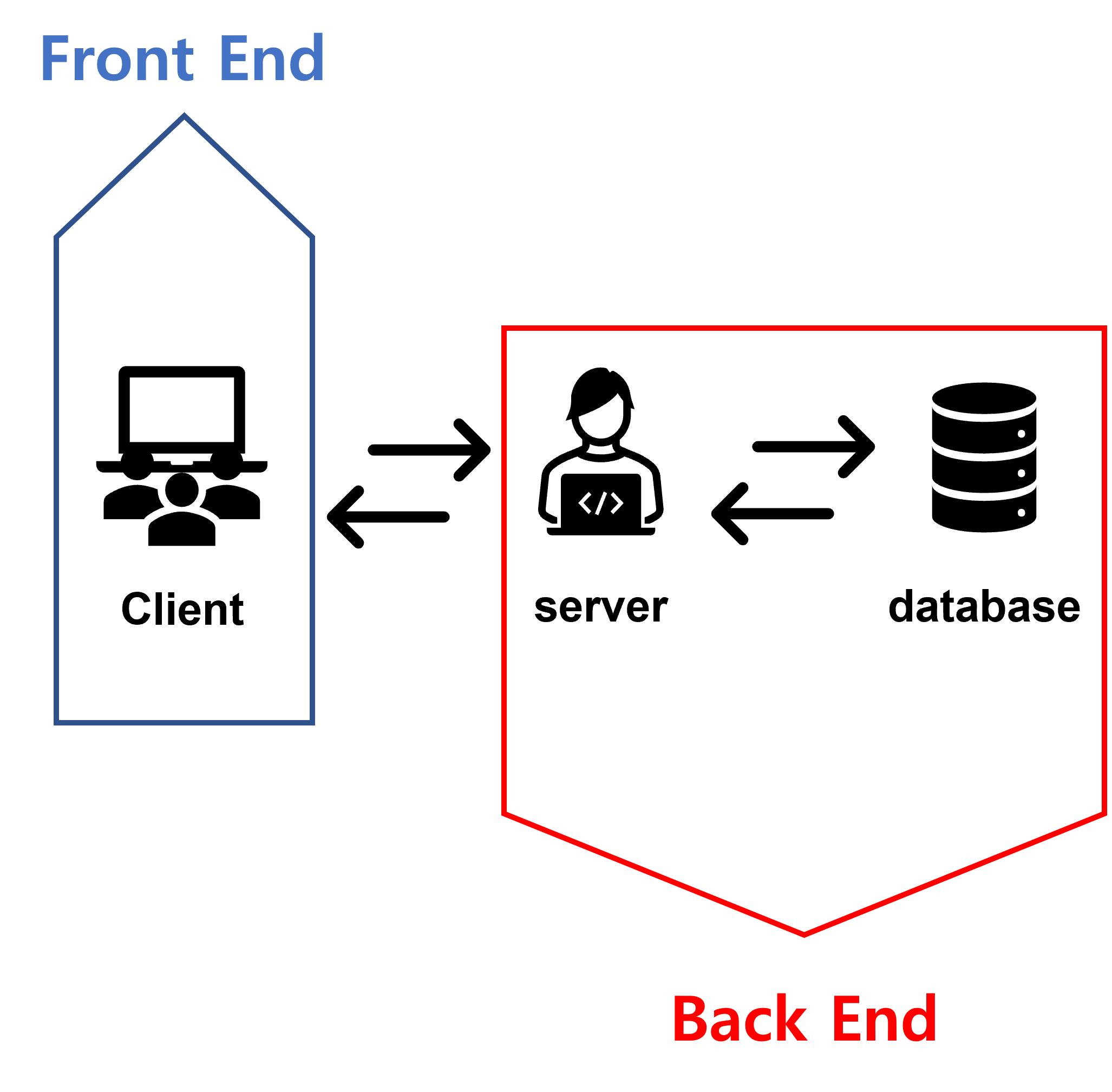클라이언트처럼 사용자가 직접 눈으로 보는 UI 클릭 또는 터치하는 등의 상호작용을 개발하면 프런트 엔드로 구분할 수 있고, 상품의 정보, 로그인, 인증 등을 다루는 개발자는 백엔드로 구분할 수 있다.